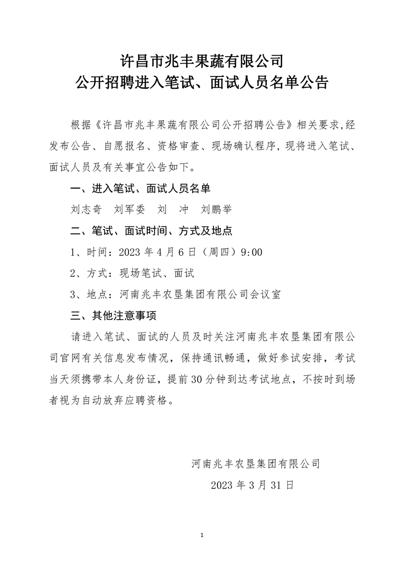 · 許昌市兆豐果蔬有限公司 公開招聘進(jìn)入筆試、面試人員名單公告