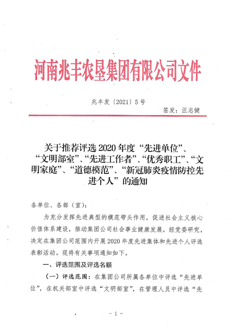 · 河南兆豐農(nóng)墾集團(tuán)有限公司 關(guān)于推薦2020年度“先進(jìn)單位”、“文明部室”、“先進(jìn)工作者”、“優(yōu)秀職工”、“文明家庭”、“道德模范”、“新冠疫情防控先進(jìn)個人”的通知