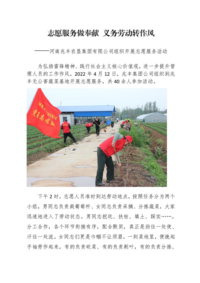 · 志愿服務(wù)做奉獻(xiàn) 義務(wù)勞動轉(zhuǎn)作風(fēng) ——河南兆豐農(nóng)墾集團(tuán)有限公司組織開展志愿服務(wù)活動